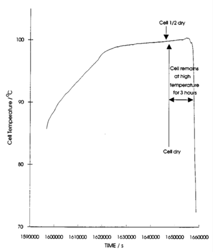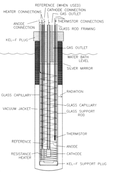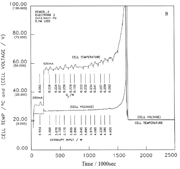 ポンズらは、1989年、リチウム(Li)を溶解した重水(D₂O)電解液を用いた電解実験で、パラジウム(Pd)陰極に異常発熱が観測されることを報告しましたが、放電を起こしたとか、爆発を起こし電解容器が壊れたとか、Pd電極が溶けたとかの記載があるだけで実験の詳細は公表されませんでした[1]。その後1994年の「Heat After Death(死後の熱)」の論文で、電解による電解液減少により定電流回路の電解電圧が高まり、更に電解液喪失により電解電力の供給が無くなった後、温度が100℃に維持されることが特に重要な現象として報告されました[2]。この論文で参照している1992年の論文には、彼らの実験状況が詳細に書かれています[3]。