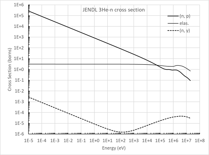 JENDL-5データベースより引用 3Heに対する中性子断面積図(実線は核反応断面積)