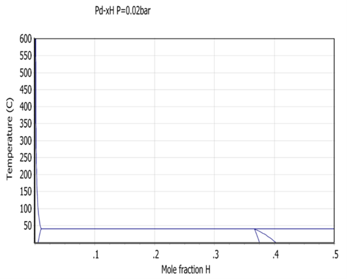 もとからアルカリ電解液には、Li+イオンとOD–イオンが主体で、D+イオンは少ない状態です。その状態から、電解液が100℃になったら、更にDは吸蔵しにくくなります。少なくとも重水素濃度の高いα’相ではなく、重水素濃度の薄いα相であったと考えられます。下図は我々が(株)計算熱力学研究所のソフト[4]を使い作成した水素圧が0.02気圧のときのPdの状態図で、横軸が原子数比です。電解で重水素ガスが発生してもその分酸素ガスも発生し、電解装置は大気解放です。死後の熱が発生したときは、電解が終了した後です。恐らくそのときの重水素圧は0.02気圧にも達していないと思われます。この状態図を見ると分かるように、水素濃度の高いα’相は40℃以下でしか発生しません。