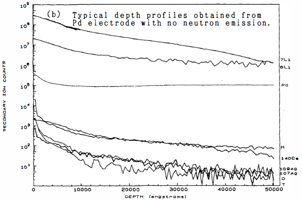別の例は、図[5]の東京工業大学岡本氏の研究での重水素電解後のPd電極表面を二次イオン質量分析(SIMS)で解析した2次イオン量の図があります。少量の重水素が吸蔵されているだけのPdが発熱を起こすとは考えられません。長時間の電解が必要な理由は、Pd電極に電解液のLiが入り込むのではないかと思い、情報をさがしていて見つけた図です。他の電極と比較して重水素量と合わせて軽水素量も異常に少ないこととから、高温に晒された履歴があると考えられるので、論文には書かれていませんが「死後の熱」を経験した電極だと考えられるものです。表面付近は天然存在の6Li/7Li比であるのに、20000Åから50000Åの深さにかけて6Li/7Li比の変化が確認され、6Li核の生成が示唆されています。この図の6Liは「死後の熱」の核反応による生成物だと確信しました。