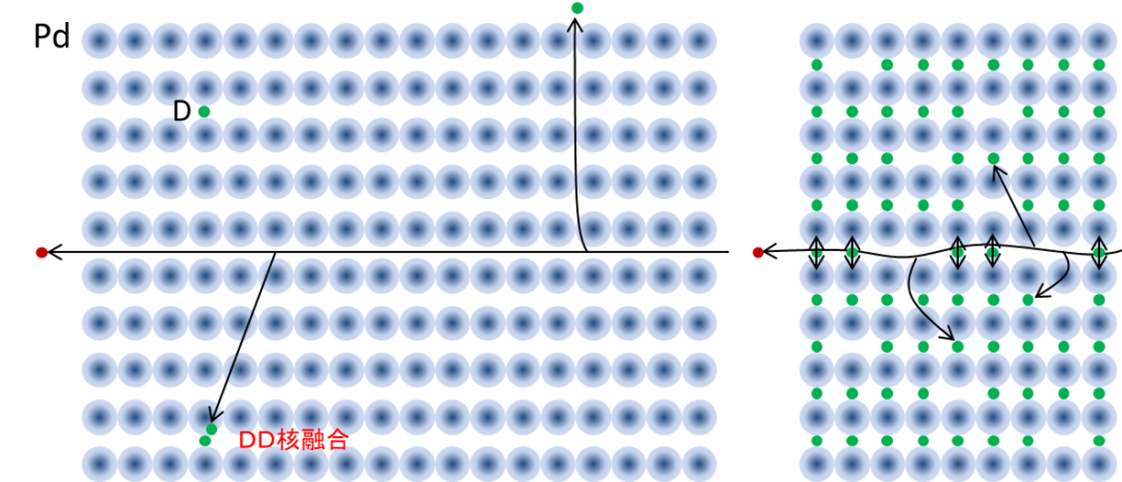 この反応で生成された、T (2.2MeV)とα (1.6MeV)イオンが、金属のチャネルに入り、格子間原子のD核と衝突し、運動エネルギーがD核に分配され、Dイオンが生成されます。
