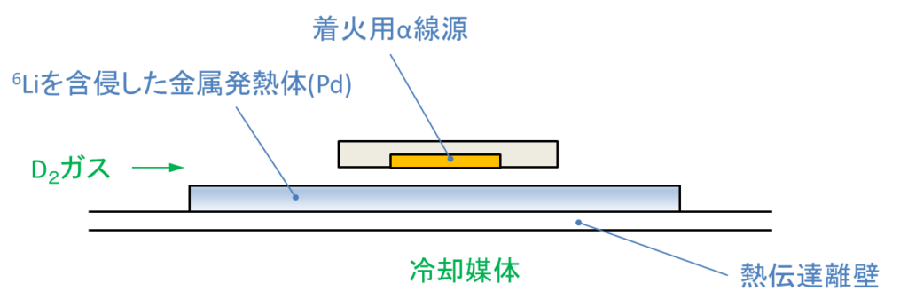 サンプルはPdの円盤を焼鈍し、結晶粒を粗大化させ、そこに6Liイオンをドープしたものです。このサンプルが金属内核融合炉実験炉の発熱体に相当します。ずいぶん経ってから分かった事実ですが、この焼鈍の時にPdの光沢を保持するために雰囲気ガスに軽水素が2%含まれていました。ここに熱中性子が入れば起動するのですが、偶然を待つわけにはいかないので、そのサンプルの上にα線源を置くことにしました。α核がD核と衝突し散乱すれば、Dイオンが生成されるからです。この状態で、75℃でベーキングを行いました。